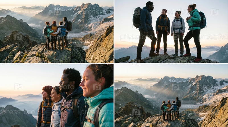 Коллаж группового похода и празднования на вершине горы, путешественное приключение, командный триумф, поездка на открытом воздухе, панорама природы