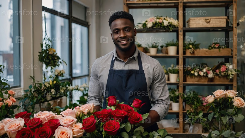 Улыбающийся цветочник в магазине готовит букет тюльпанов на день рождения, свадьбу или доставку ко Дню женщин