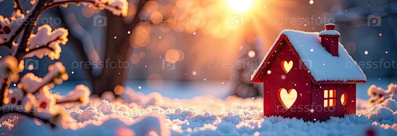 Уютный красный крошечный дом на снегу в солнечных лучах, украшенный красным сердцем и декором Валентина