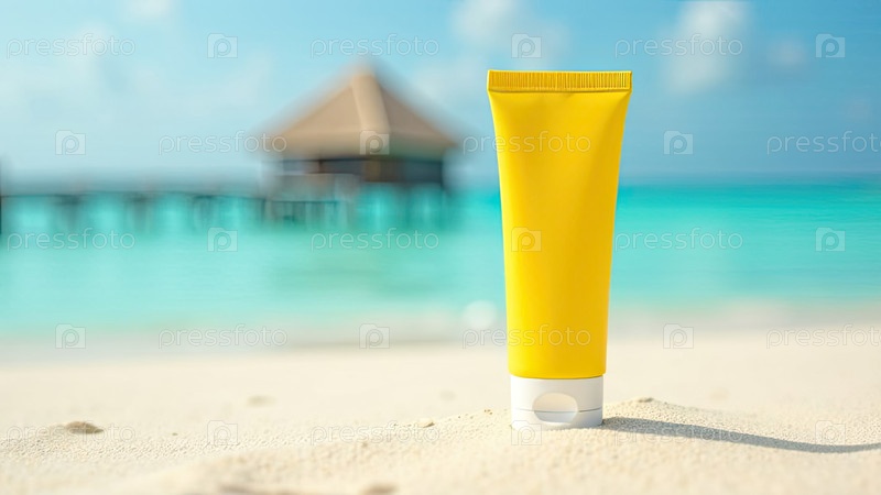 Желтая трубка макет солнцезащитного крема на белом песке пляжа на фоне синего океана. Ультрафиолетовая защита кожи, солнцезащитный крем. ИИ генерируется