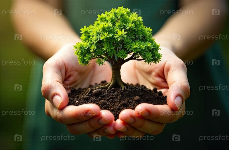 Крошечное зеленое дерево в горстке земли в руке в земле на близком расстоянии.Экология, уход, бонсай.Искусственный интеллект создан