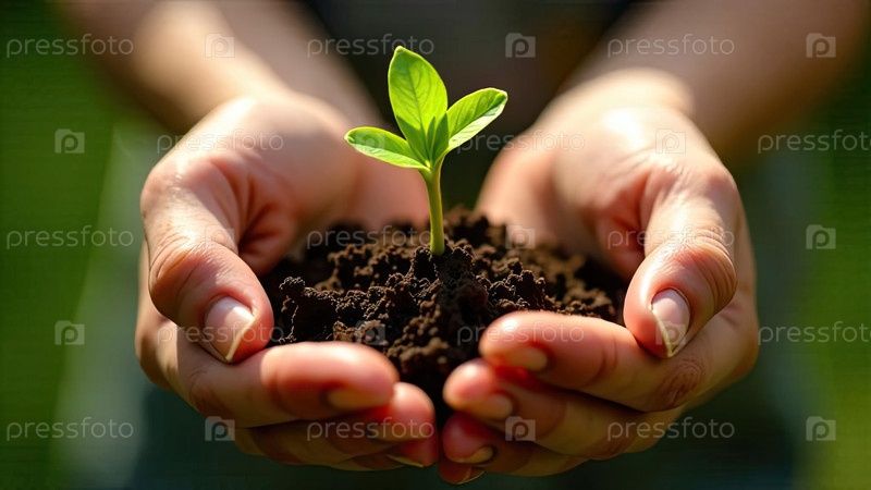 Молодой зеленый побег в горстке земли в ладонях фермера растений в земле на близком расстоянии