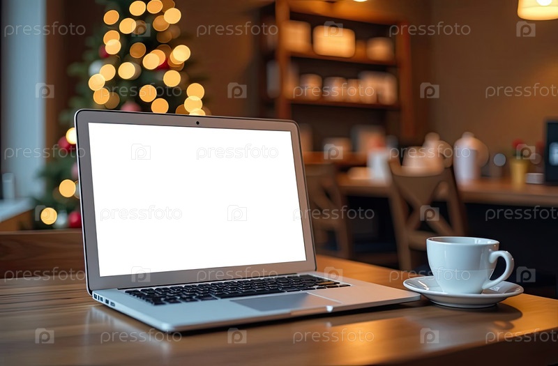 Ноутбук с белым экраном макет на столе в уютном кафе в стиле лофт со стаканом кофе, домашний офис рождественского декора