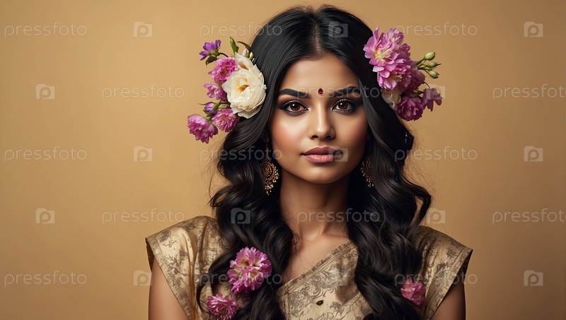 Индийская женщина с волнистыми волосами и фиолетовой цветочной короной, коричневый фон, портрет весенней красоты, женственность, классическая традиция, 8 марта, женский день
