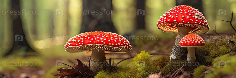 Два гриба Аманита в лесу, символ народного лекарства, опасный яд и традиционная медицина, психоактивные диетические добавки