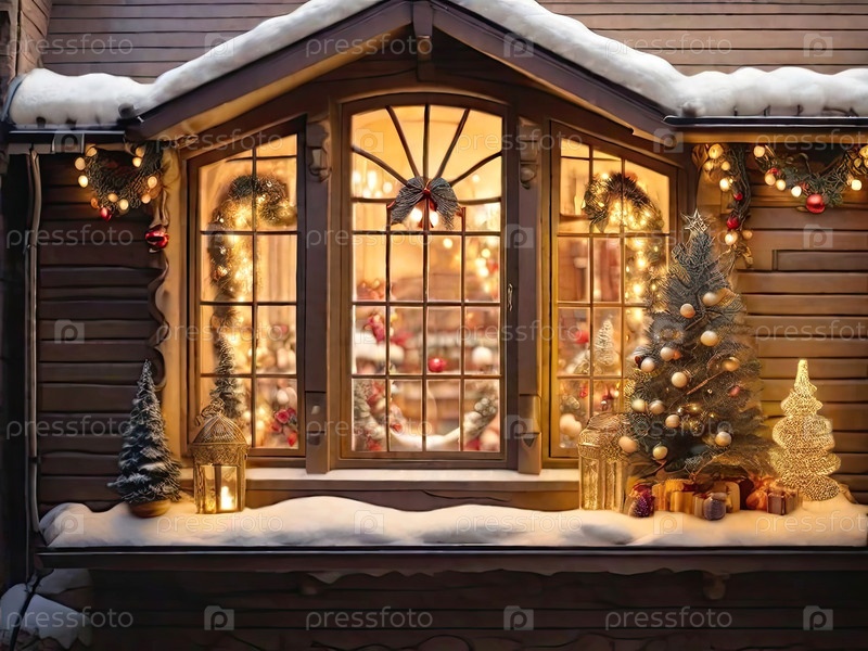 Уютное окно с рождественским декором и теплым светом внутри - вид снаружи дома. отпразднуйте Рождество и Новый год, елку, боке, снег. ИИ генерируется