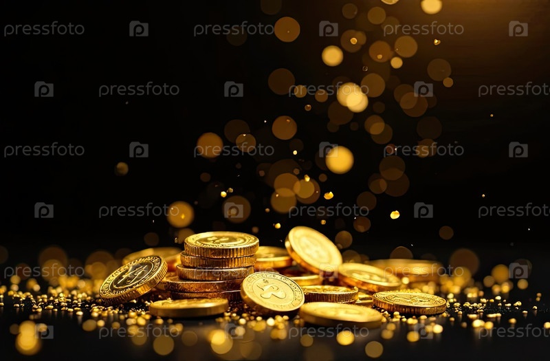 Стол золотых монет на черном фоне с блеском.Сбережения, инвестиции, капитал, бизнес.Искусственный интеллект генерирует