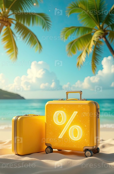 Золотой светящийся знак процент И желтый чемодан на берегу моря с тропическими пальмами под ярким солнцем, океанический закат в фоне. Горячие летние распродажи и скидки, горячий туристический баннер, листовка. AI генерируется