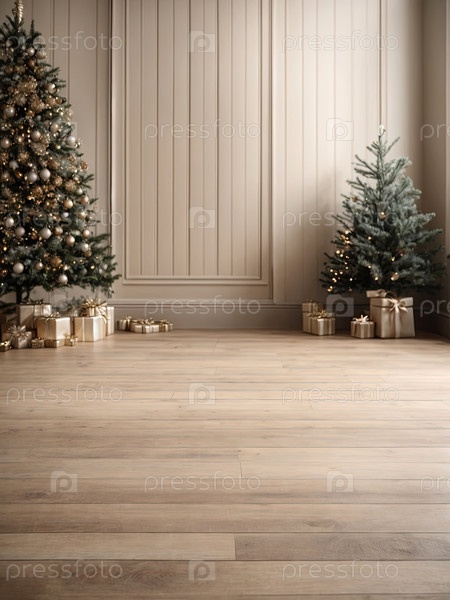 Пустой деревянный пол в нейтральных естественных бежевых тонах для отображения продукции со стеной во внутренней части комнаты, с рождественским декором. Копирование пространства, Рождество и Новый год. ИИ генерируется