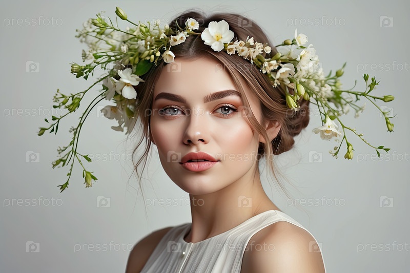Белая женщина с светло-коричневыми волосами и бело-зеленым цветочным венком, портрет весенней красавицы, минимальная флористика, свежесть, женственность, 8 марта, женский день