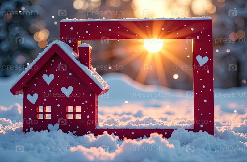 Уютный красный крошечный дом на снегу в солнечных лучах, украшенный красным сердцем и декором Валентина