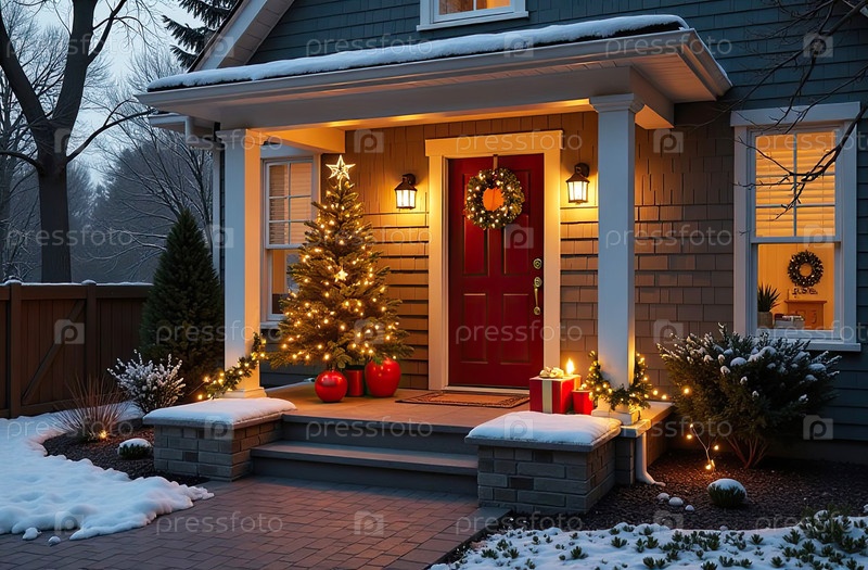 Уютный крыльцо дома ночью с рождественскими деревьями и подарками зимой в снегу с Рождественским наружным праздничным декором