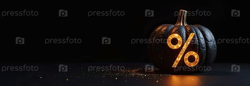 Золотой светящийся процентный знак с тыквой на черном фоне со свободным местом для текста. Осенние распродажи и скидки, баннер Harvest и Halloween, флаер с пространством для копирования. ИИ генерируется
