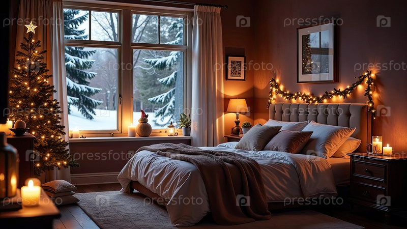 Уютная спальня с кроватью у окна с рождественским декором и елкой, теплыми гирляндами света и свечами - вид изнутри зимой и снегом. Отпразднуйте Рождество и Новый год, рождественское настроение. ИИ генерируется