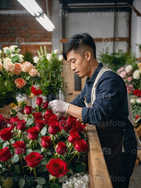 Азиатский цветочник на рынке готовит букеты весенних пионьев, красных роз и тюльпанов для празднования Ханами, Дня матери и фестиваля Тет