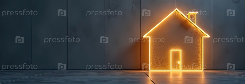 Прозрачное золото светящийся символ дома на сером бетонном фоне с золотым блеском. недвижимость, риэлтор, ипотека, страхование, бронирование, строительство, изоляция, отопление. ИИ генерируется