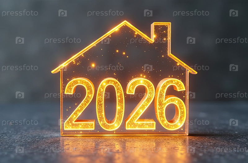 Прозрачное золото светящиеся номера 2026 под крышей дома на сером бетонном фоне с золотым блеском. недвижимость, риэлтор, ипотека, страхование, бронирование. ИИ генерируется