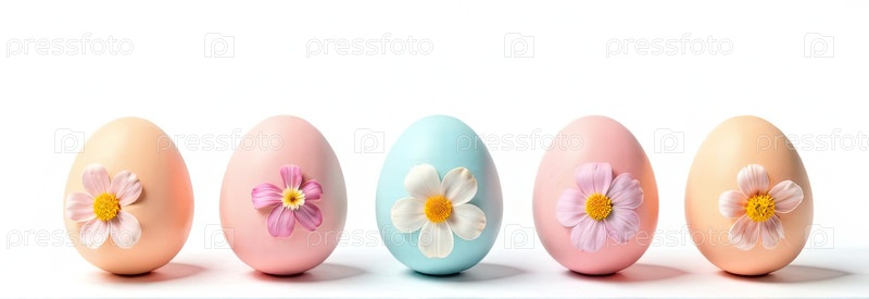 Внизу изображения пять яиц со свободным пространством сверху изображения для текста, с применением естественных весенних цветов на пастельных цветах яйца, белый фон. Пасхальный баннер с пробелом для текста. ИИ генерируется