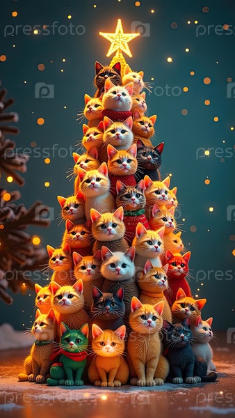 Рождественская елка из кошек сделана на праздничном фоне с блеском, многоцветная сотни котов складываются в форме высокой рождественской елки с золотыми светящимися гирляндными огнями