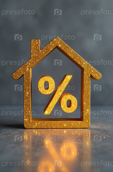 Золотой светящийся символ процент в доме на сером бетонном фоне с золотым блеском. строительство жилья, скидка, купон, покупка, продажа, риэлторская деятельность, ипотека, страхование, бронирование. AI generated