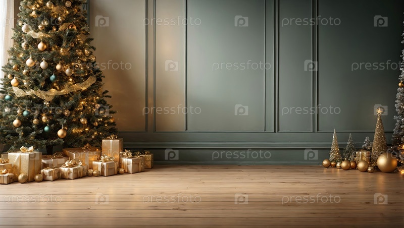 Пустой деревянный пол в нейтральных тонах для отображения продукции со стеной во внутренней части комнаты в зеленых и коричневых тонах, с рождественским декором. Копирование пространства, Рождество и Новый год. ИИ генерируется