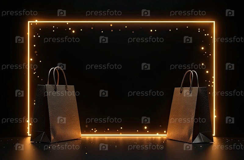 Неоновая светящаяся золотая рама с пространством для текста, процентный знак, сумки покупок на черном фоне. витрина магазина в Черную пятницу, распродажа, скидки, баннер, флаер. ИИ генерируется