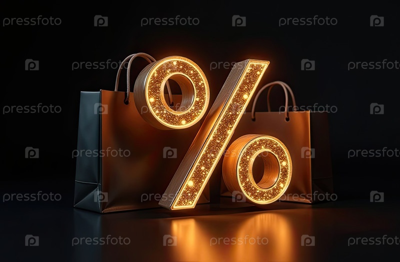 Неон светящийся золотой процентный знак на черном фоне. витрина магазина для Черной пятницы, распродажи, скидки, сумки для покупок. баннер, флаер. AI generated