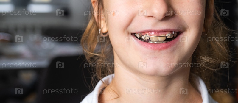 Улыбающаяся девочка школьного возраста, ортодонтическая пластина для правильного прикуса и выравнивания зубов, положительный результат
