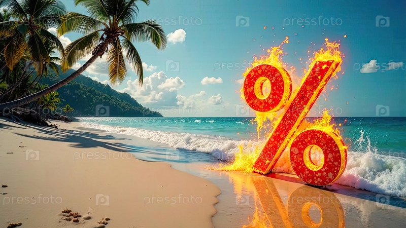 Огненный горящий знак процент на берегу моря с тропическими пальмами в свете солнца, фон заката океана. жаркая летняя распродажа и скидки, горящий тур-баннер, флаер. ИИ генерируется