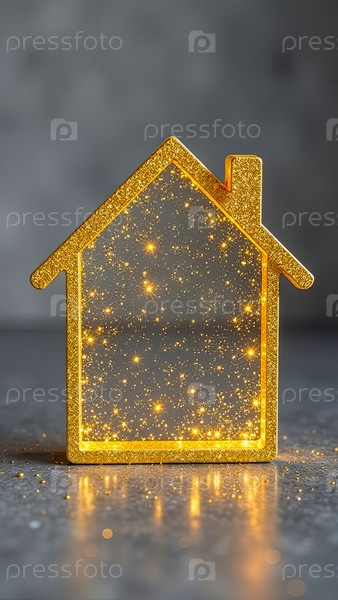 Прозрачное золото светящийся символ дома на сером бетонном фоне с золотым блеском. недвижимость, риэлтор, ипотека, страхование, бронирование, строительство, изоляция, отопление. ИИ генерируется