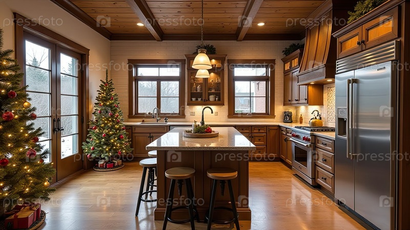 Верхний интерьер уютной современной рождественской кухни, новогоднее настроение, подготовка к празднику, посуда. Рождественский декор современной кухни, снег снаружи окна. ИИ генерируется