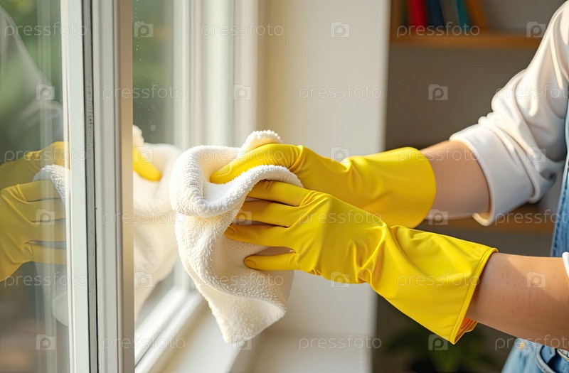Руки в желтых резиновых перчатках моют окно салфеткой на близком расстоянии. служба очистки окон, уборка дома. созданный ИИ