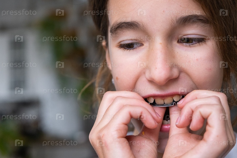Процесс введения ортодонтической пластины, девочка школьного возраста, детская стоматологическая коррекция, прибор для выравнивания укусов