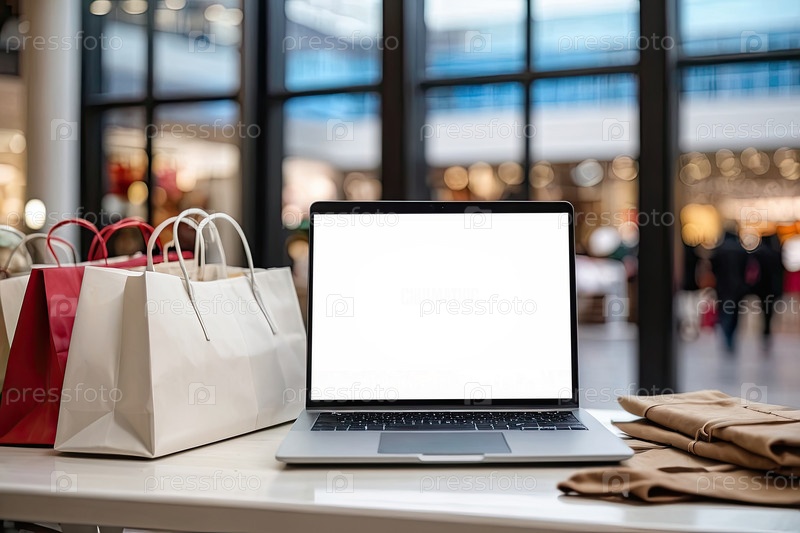 Ноутбук с белым экраном макет на столе в офисе в торговом центре рождественского декора с сумками, сумочками для покупок, пакетами, Черная пятница,