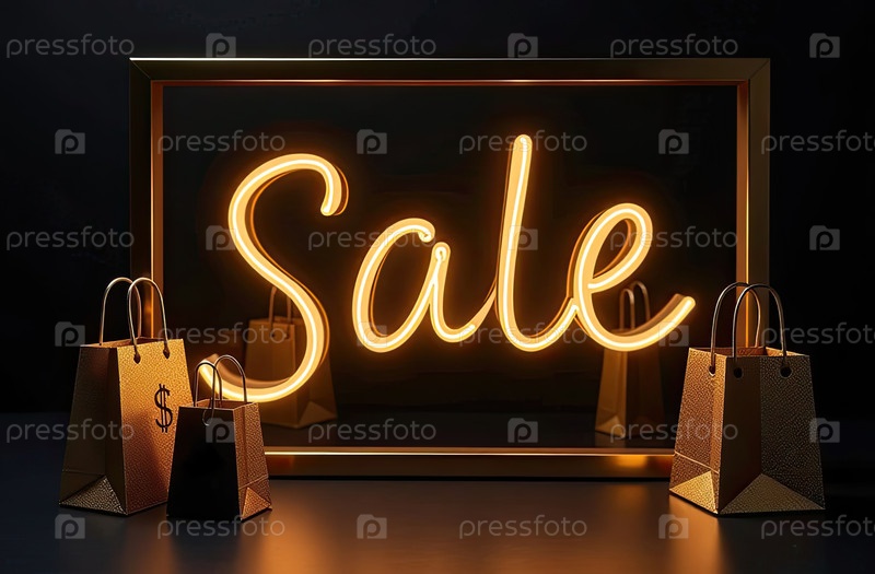 Продажа на черном фоне. витрина магазина для Черной пятницы, скидки, сумки с покупками, созданный ИИ
