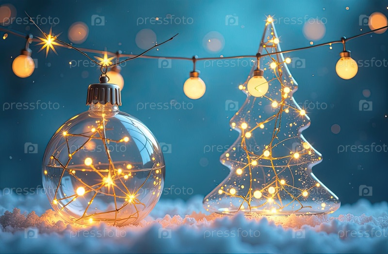 Светящаяся рождественская елка из прозрачных светящихся золотых шаров на синем фоне с блеском. поздравительная карточка на Рождество и Новый год с копировальным пространством. ИИ генерируется
