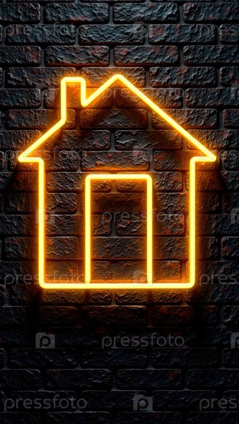 Прозрачное золото светящийся символ дома на фоне черной кирпичной стены с золотым блеском. недвижимость, риэлтор, ипотека, страхование, бронирование, строительство, изоляция, отопление. AI generated