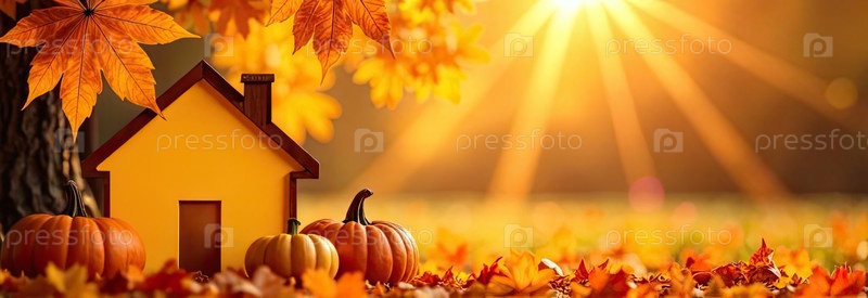 Крошечный эко-дом в солнечных лучах украшен желтыми кленовыми листьями на осеннем фоне. недвижимость, дача, летний дом, ипотека, страхование, бронирование, строительство, изоляция. ИИ генерируется