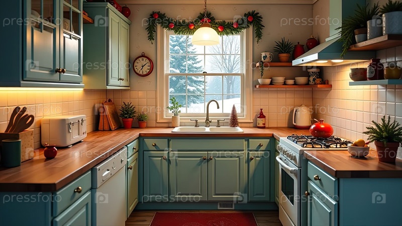 Верхний интерьер уютной современной рождественской кухни, новогоднее настроение, подготовка к празднику, посуда. Рождественский декор современной кухни, снег снаружи окна. ИИ генерируется