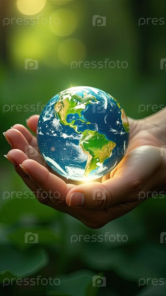 Стеклянная светящаяся сфера планеты Земля На ладонях находится шар с внутренним микроклиматом, заботой о планете, чистой окружающей среде, защитой экологии, географии, континентов, путешествий