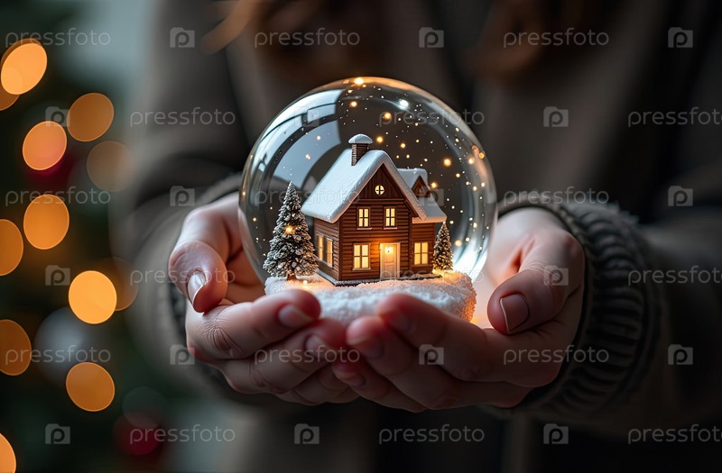 Магический стеклянный шар с крошечным современным домом и снегом внутри в уютной руке с рождественской елкой с гирляндами на фоне. страхование, ипотека, покупка недвижимости. ИИ генерируется
