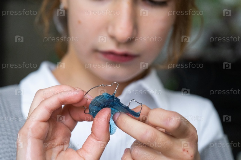 Детский крупный план: руки девочки держат синюю ортодонтическую пластину для выравнивания зубов и челюсти