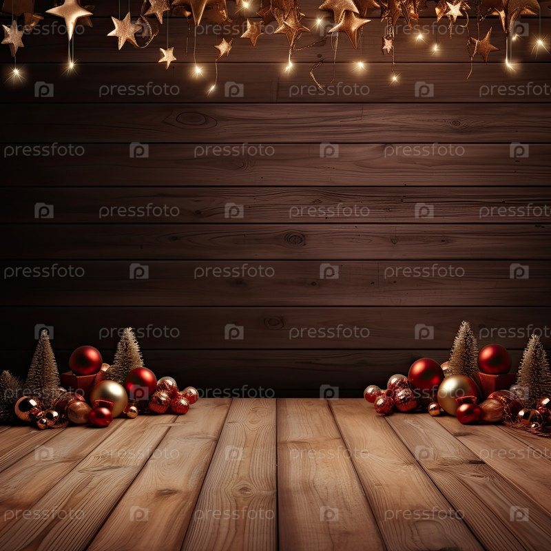 Пустой деревянный пол и стена для монтажа продуктового дисплея с рождественским декором, боке, секины и фейры. Копирование пространства, Рождество и Новый год. ИИ генерируется