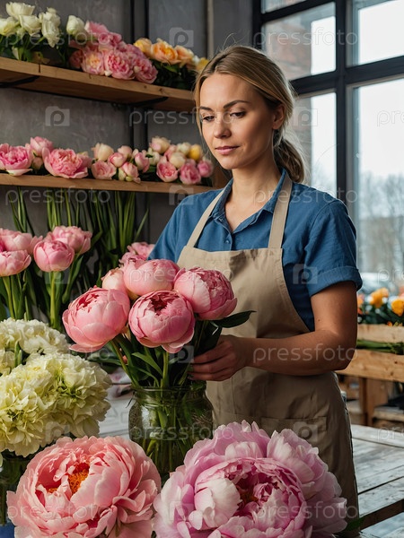 Европейская флористка в цветочной студии с огромными пионами, готовя роскошный букет на День матери и романтические мероприятия