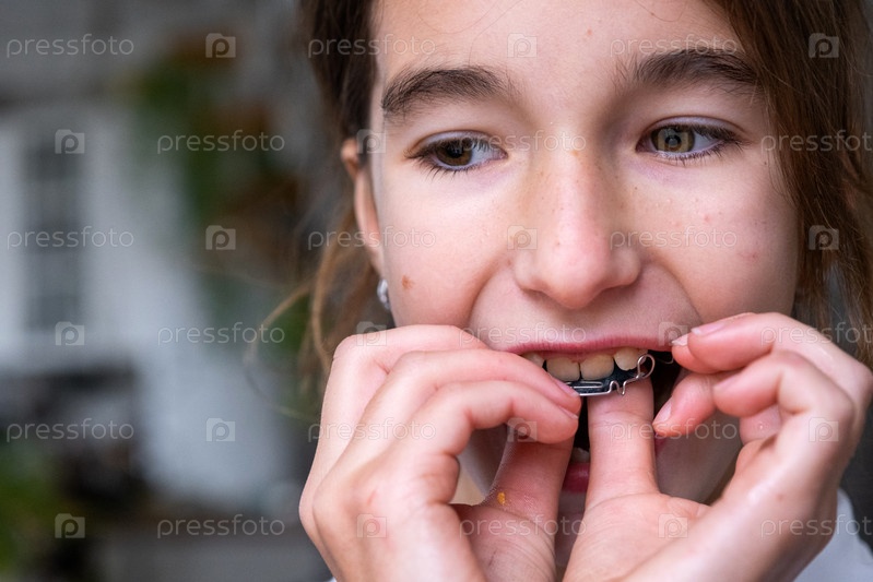Шаг за шагом детская ортодонтия: девочка позиционирует прибор зубной пластины во рту для выравнивания зубов и челюсти