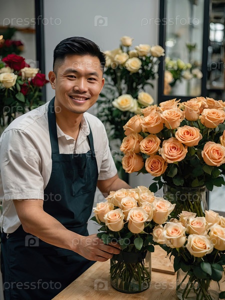 Азиатский цветочник в цветочном магазине с букетами оранжевой розы и белого пионья для открытия, свадьбы и фестивалей