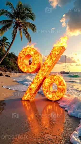 Огненный горящий знак процент на берегу моря с тропическими пальмами в свете солнца, фон заката океана. жаркая летняя распродажа и скидки, горящий тур-баннер, флаер. ИИ генерируется