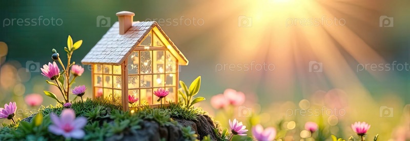Крошечный эко-дом теплица в солнечных лучах, с весенними цветами на весеннем пастельном фоне. недвижимость, дача, летний дом, ипотека, страхование, бронирование, строительство, изоляция. ИИ генерируется