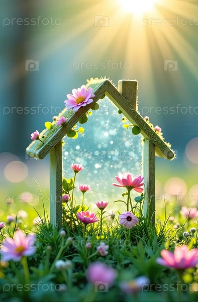 Крошечный экологический дом теплица в солнечных лучах, с весенними пастельными цветами на весеннем пастельно-синем фоне. недвижимость, риэлтор, ипотека, страхование, бронирование, строительство, изоляция. ИИ генерируется