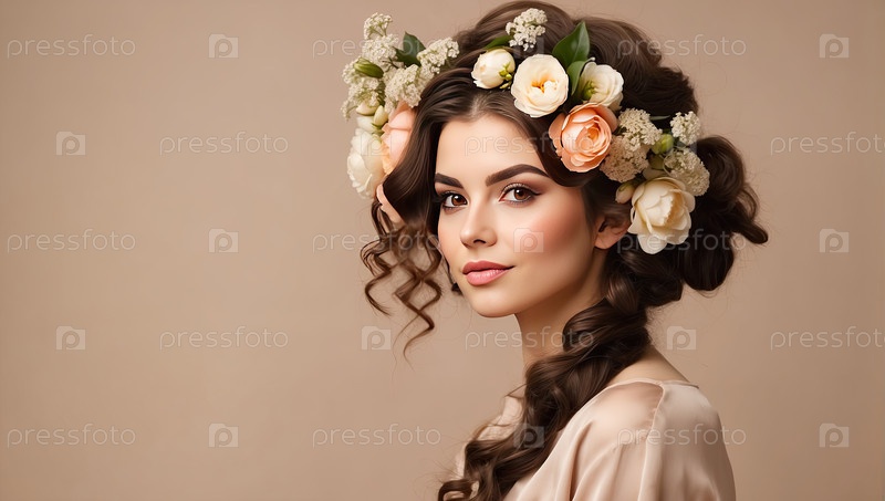 Брюнетка с короткими локонами и белой цветочной короной, бежевый фон, портрет весенней флористики, женственность, нежность, романтика, 8 марта, женский день